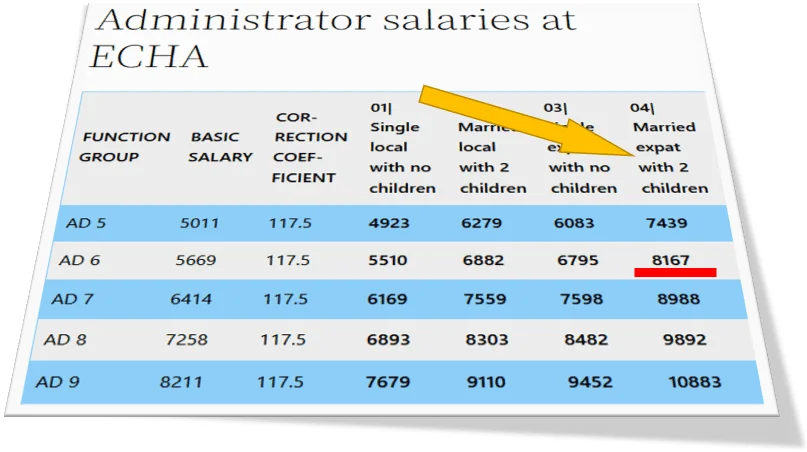 Most EU institutions, including ECHA, do a notoriously poor job in communicating their salaries. Very often EU agencies and other EU institutions just indicate the gross basic pay without deductions and allowances, and quite many do not adjust it by the Correction Coefficient which can have a significant impact on an employee’s net take-home pay.